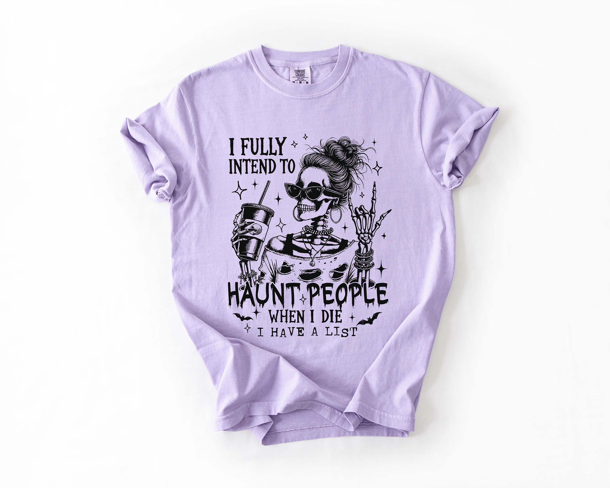 Some grudges are forever—and this tee says it loud and clear: “I fully intend to haunt people when I die (I have a list).” Featuring a skeleton with messy bun, oversized sunglasses, and a drink in hand, this design mixes humor, sass, and just the right amount of spooky.