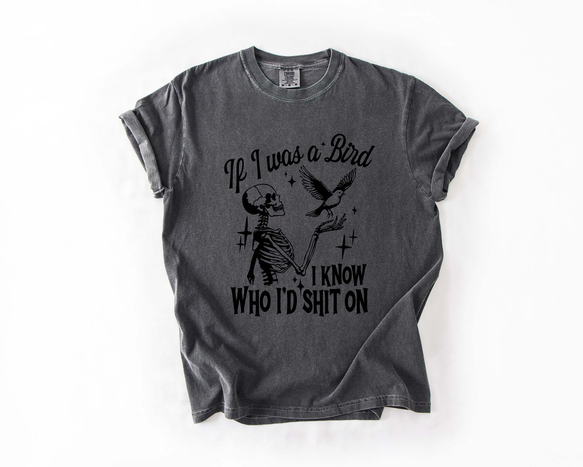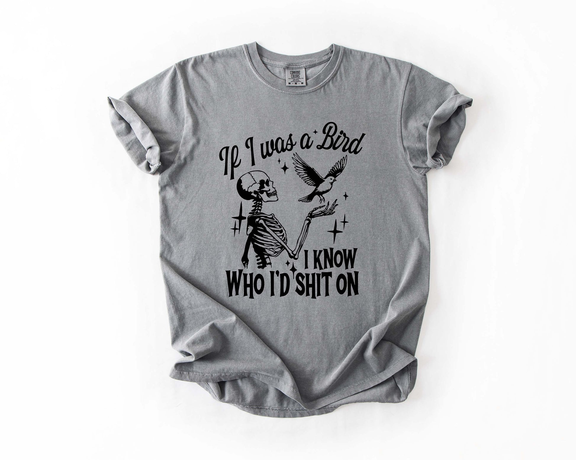 Savage, sarcastic, and just the right amount of dark humor—this tee doesn’t hold back. Featuring a skeleton hand holding out a bird, paired with the bold phrase: “If I was a bird, I know who I’d sht on,”* it’s the perfect shirt for anyone who likes their humor a little wicked.