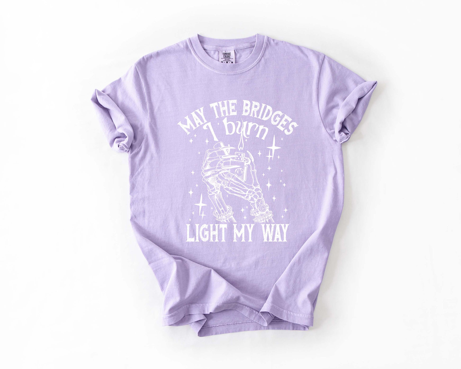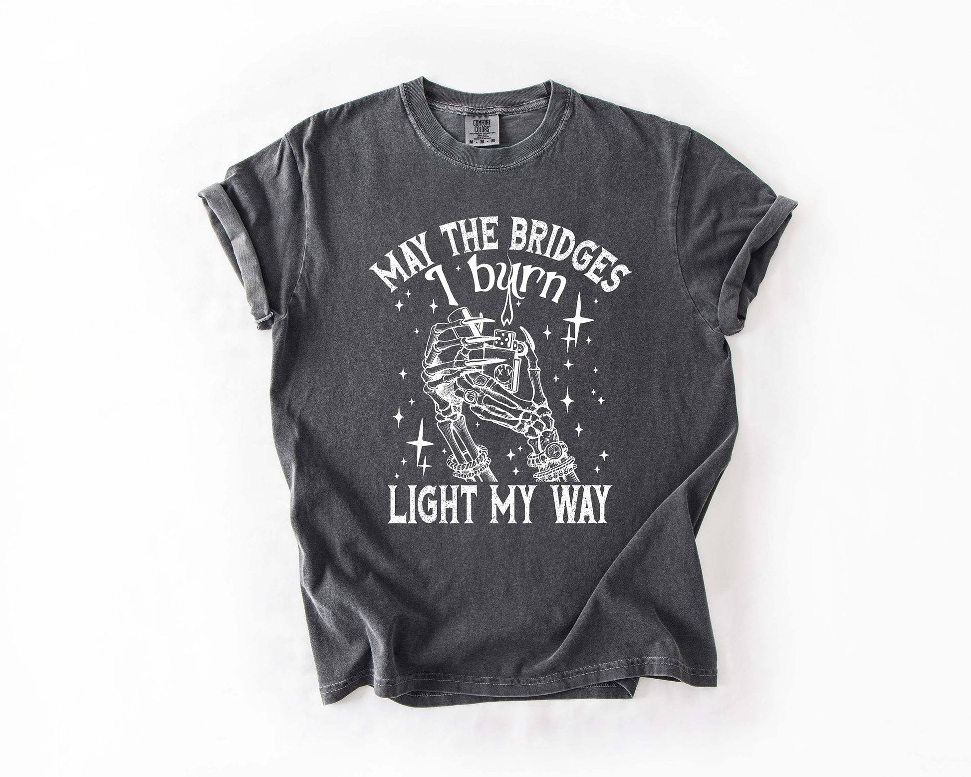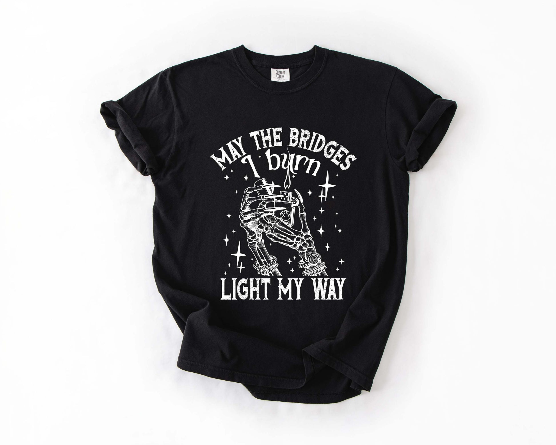 Turn endings into new beginnings with this bold statement piece. Featuring a striking skeleton hand holding a lighter surrounded by stars, this tee carries the powerful reminder that sometimes burning bridges is what lights the path forward.
