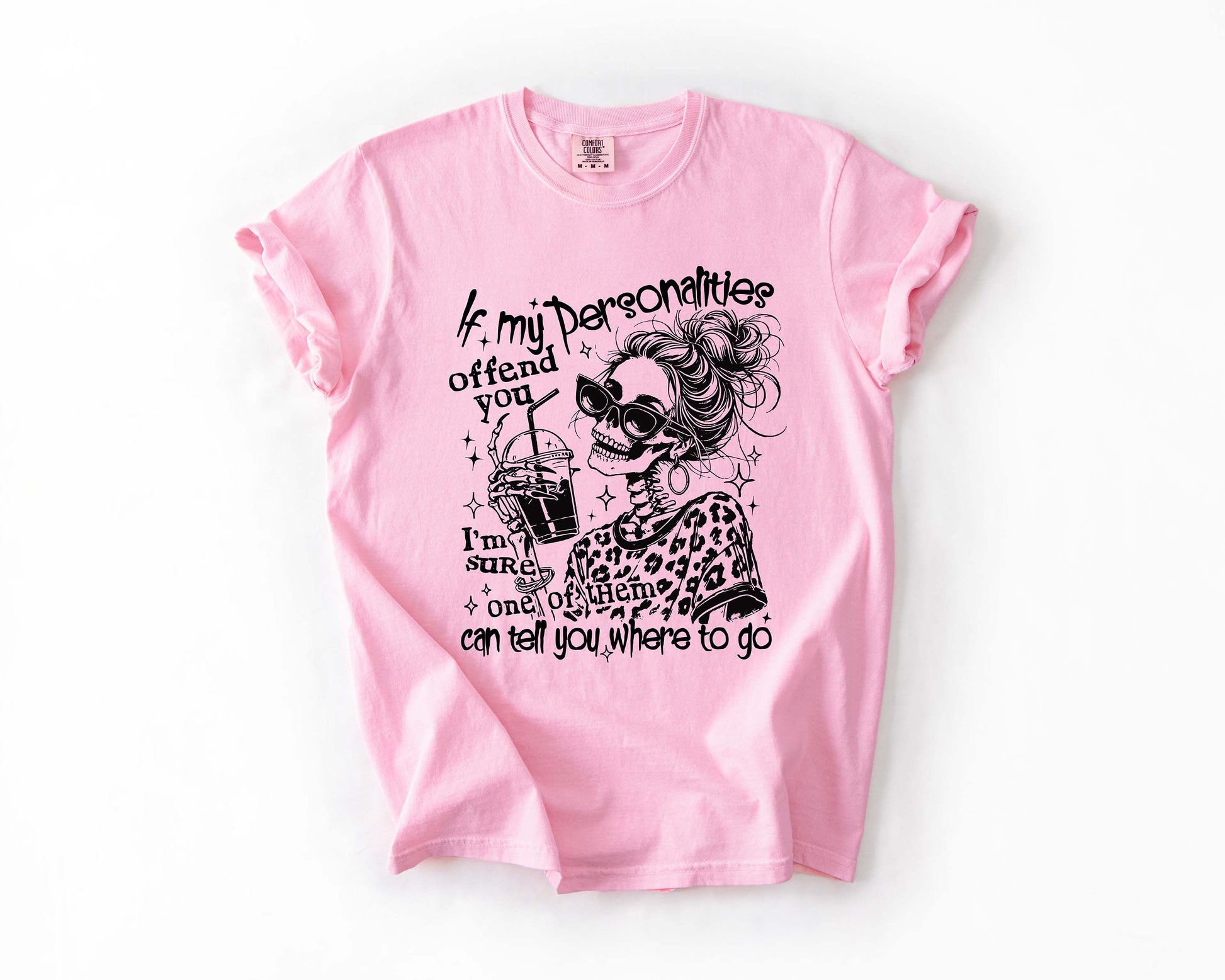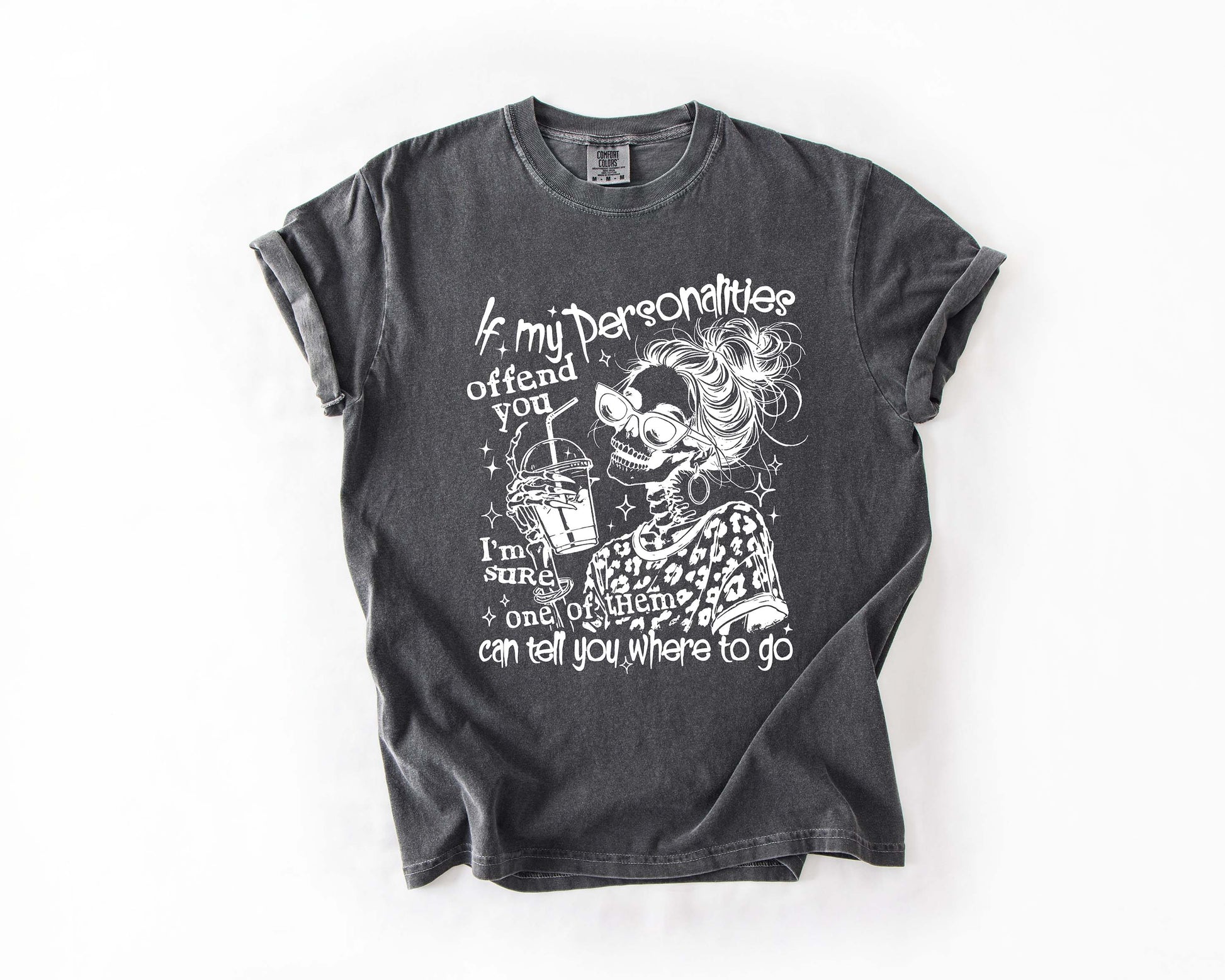 This one’s for the unapologetically bold. Featuring a skeleton rocking messy-bun vibes, oversized shades, and an iced coffee in hand, this tee declares: “If my personalities offend you, I’m sure one of them can tell you where to go.” It’s equal parts sass and humor, perfect for anyone who speaks fluent sarcasm.